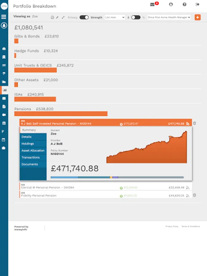 Think of it as your digital financial filing cabinet. All of your investments, savings, pensions, insurances, and property can be tracked together with all of the associated paperwork.