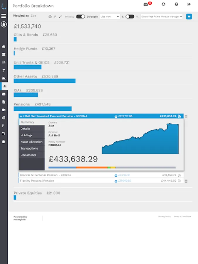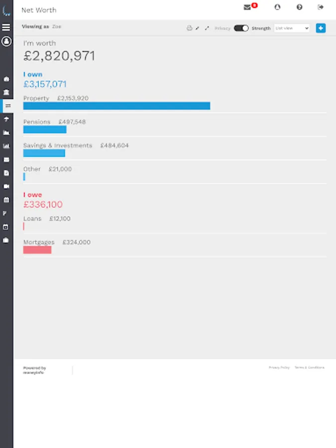 Think of it as your digital financial filing cabinet. All of your investments, savings, pensions, insurances, banking, credit cards and property can be tracked together with all of the associated paperwork.