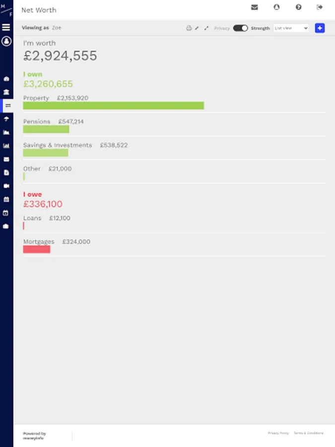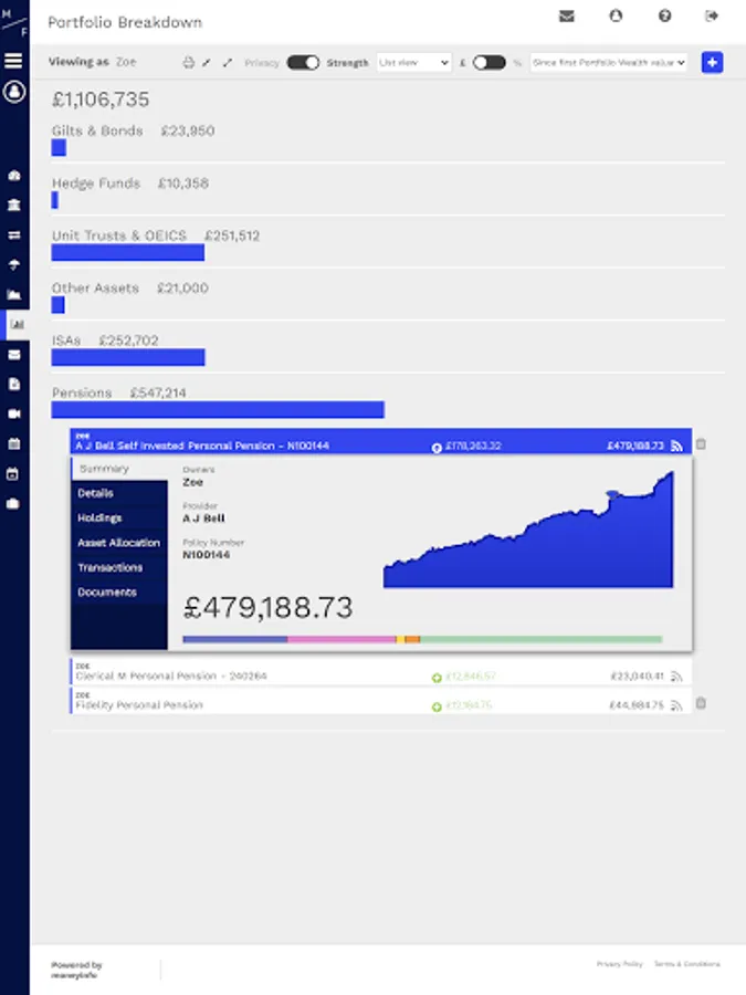 Think of it as your digital financial filing cabinet. All of your investments, savings, pensions, insurances, banking, credit cards and property can be tracked together with all of the associated paperwork.