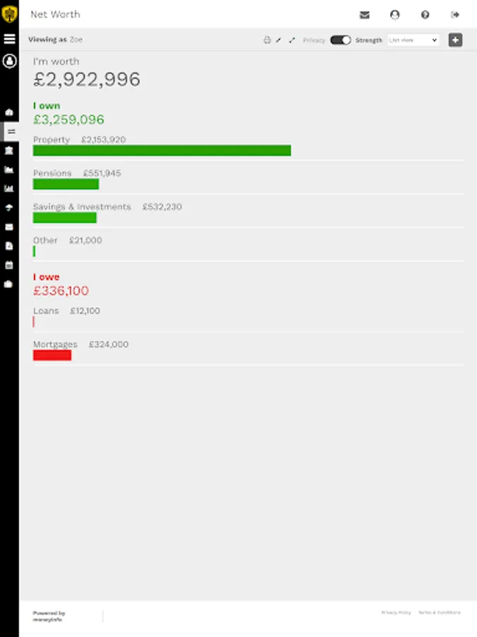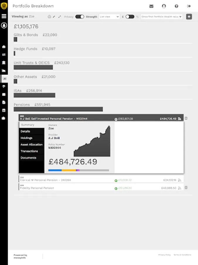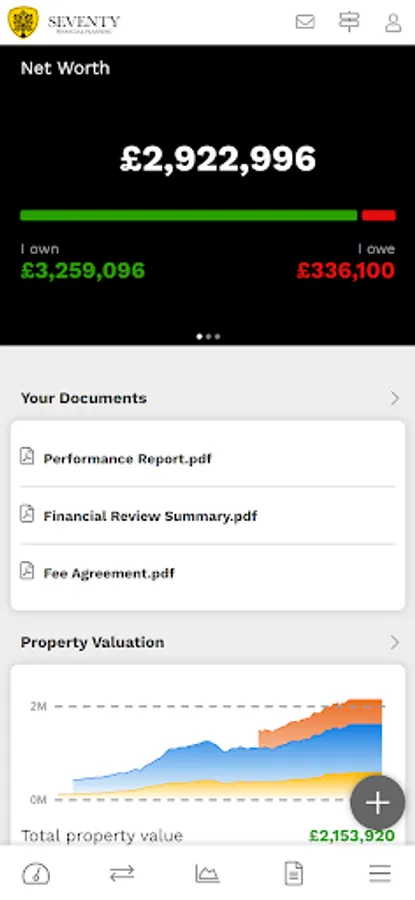 Think of it as your digital financial filing cabinet. All of your investments, savings, pensions, insurances, and property can be tracked together with all of the associated paperwork.