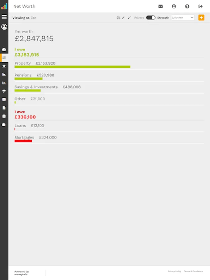 Think of it as your digital financial filing cabinet. All of your investments, savings, pensions, insurances, banking, credit cards and property can be tracked together with all of the associated paperwork.