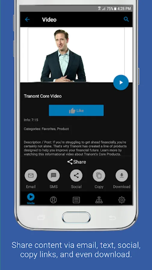 Media: It has never been easier to share information about your products and opportunity via SMS text, email, or social media. Simply choose from the library of content and digital tools specifically designed to promote your business and share them with a contact. You'll even receive a notification when they view the tools so you know exactly when to follow up! No data connection? No problem! Simply download content in the app beforehand for offline playback.