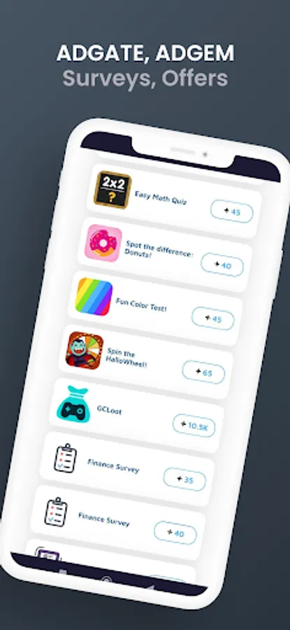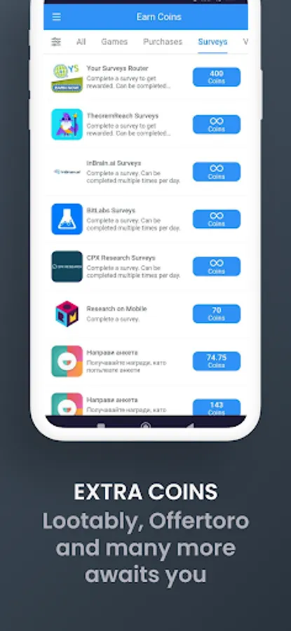 Earn Coins from many available popular offerwall sites, such as AdGem, TimeWall, Offertoro, AdGate Media, Adscend Media, Monlix, Notik, AyetStudios, and many more. Pick your favorite surveys from Bitlabs and CPX Research or try out new multi rewarded tasks within Offertoro and Ayet-Studios. Fast payout credits and rewards from TimeWall Offerwall. Watch new videos in Adscend Media and Loot TV.