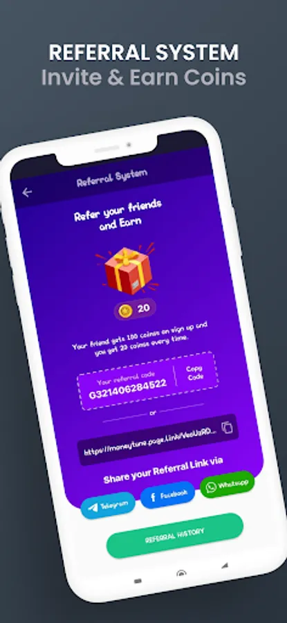 You can invite your friends using your unique referral code. The more friends you invite, the more coins you will earn. For each friend that enters your referral code, you will earn a considerable amount of coins. Your friend will also earn a one-time huge bonus for entering your referral code. Start inviting your friends today to make money online