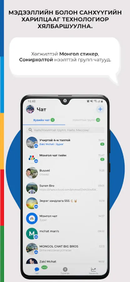 Монголын үндэсний сошиал аппликейшн. Монгол чат танд дараах боломжуудыг олгож байна: