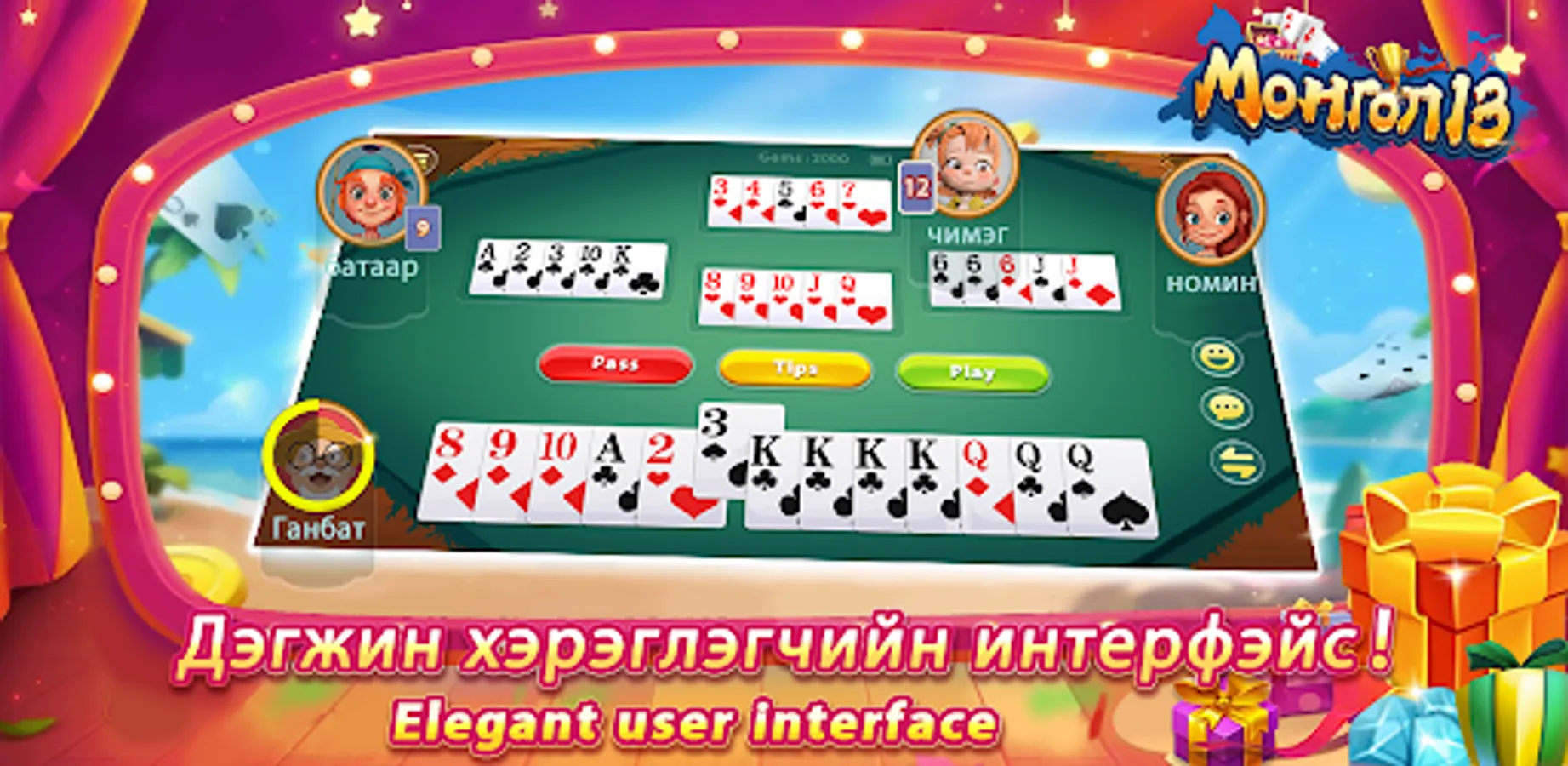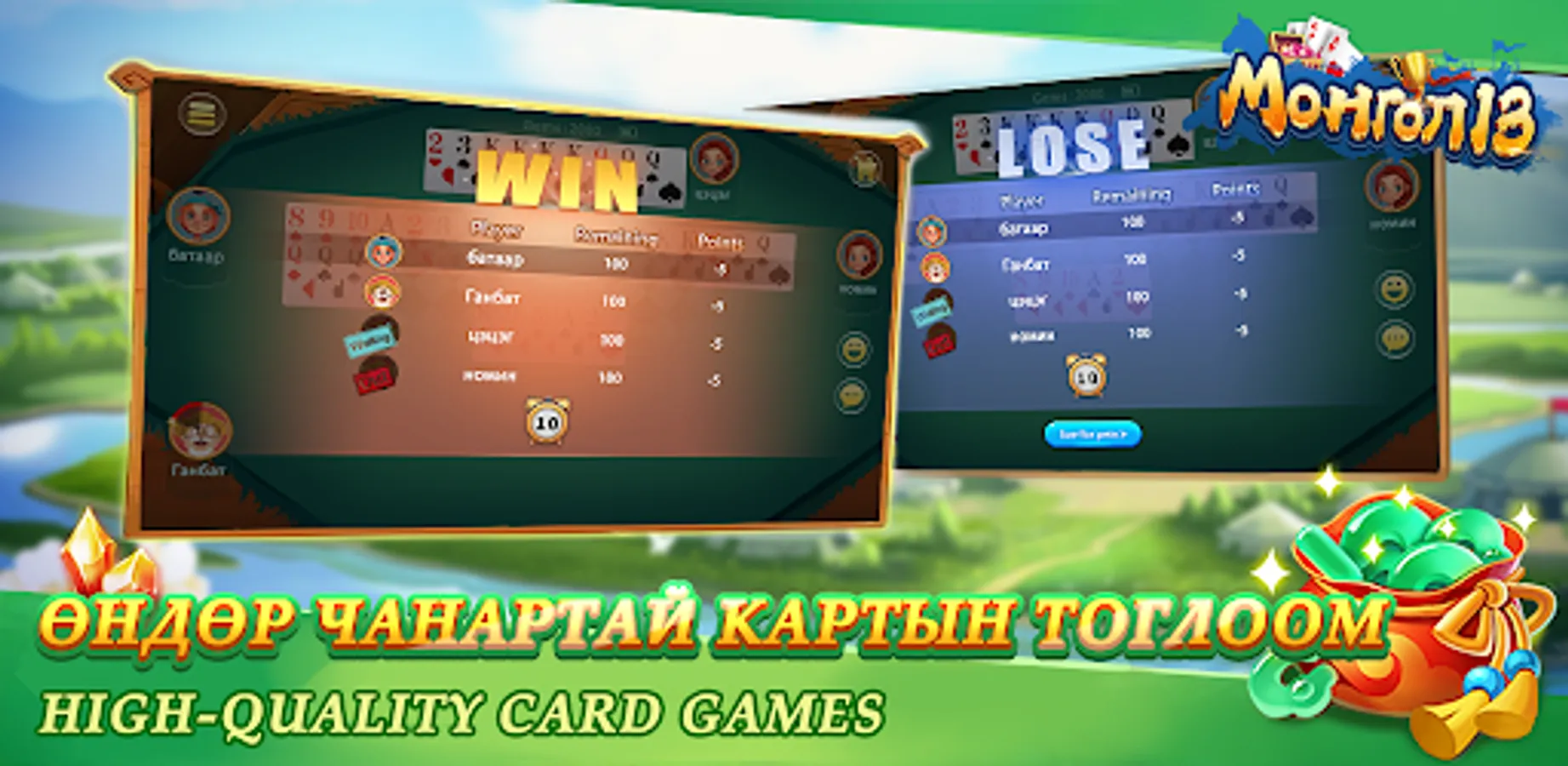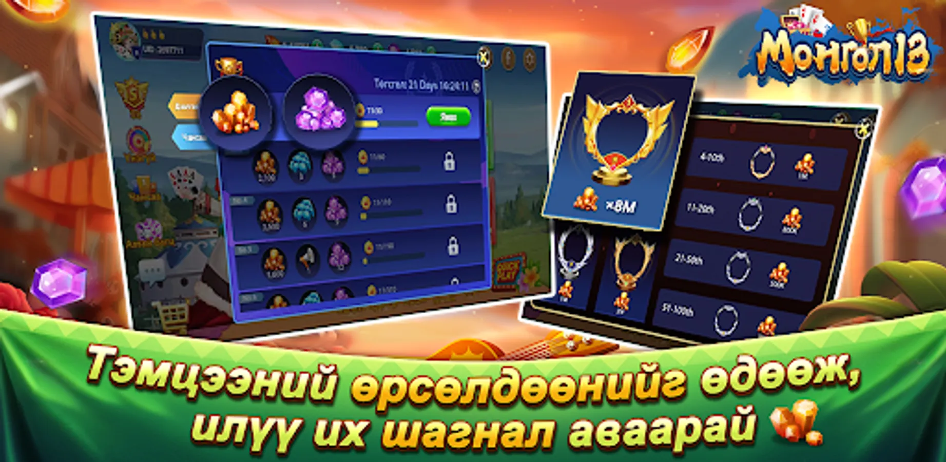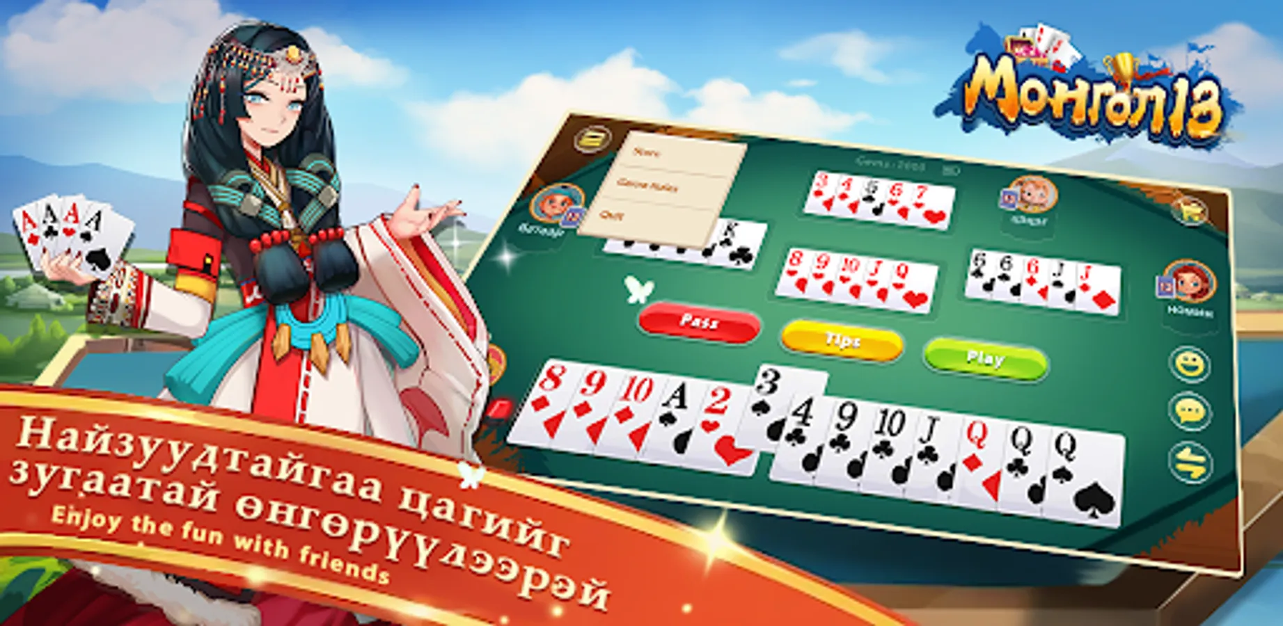 Монгол 13 нь Монголын хамгийн алдартай хөзрийн тоглоомуудын нэг бөгөөд гадаад, дотоодод байгаа найз нөхөд, гэр бүлийн гишүүдтэйгээ харилцах, онлайн покероор хамтдаа цагийг зугаатай өнгөрүүлэх, бүх насныхны нөхөрлөл, харилцаа холбоогоо үргэлж хадгалах зугаатай хэрэгсэл юм! Илүү олон сонгодог тоглоом тун удахгүй гарах болно!