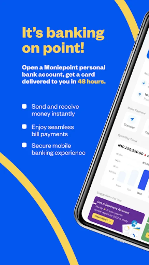 1: Send and Receive Money with Ease: With Moniepoint, you can effortlessly send and receive money instantly. Say goodbye to the hassles of traditional banking and enjoy instant and secure transfers at your fingertips. No queues, no paperworks, instant alert notification.