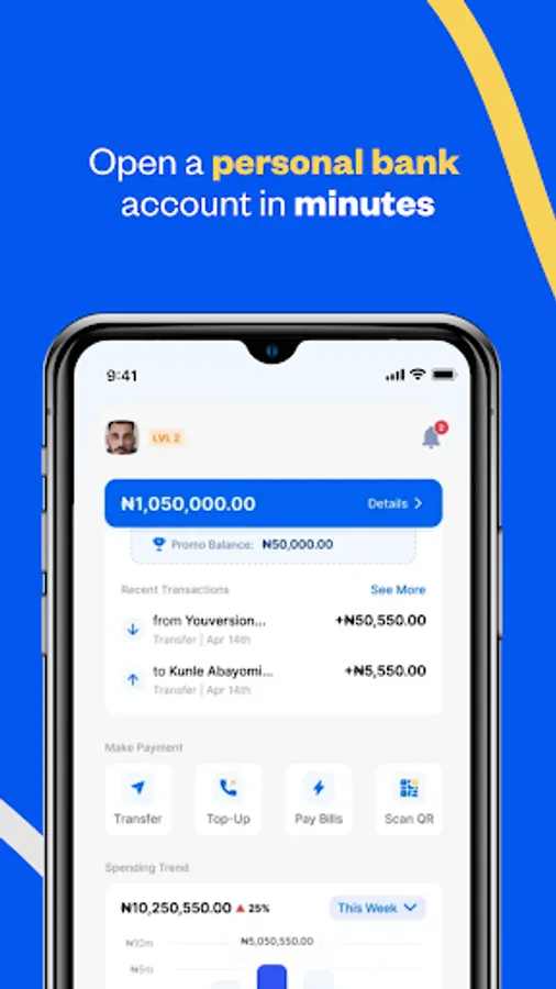 Open a functional bank account in minutes right from your phone. Send and receive money instantly, pay bills, buy airtime and data, conveniently from your mobile phone