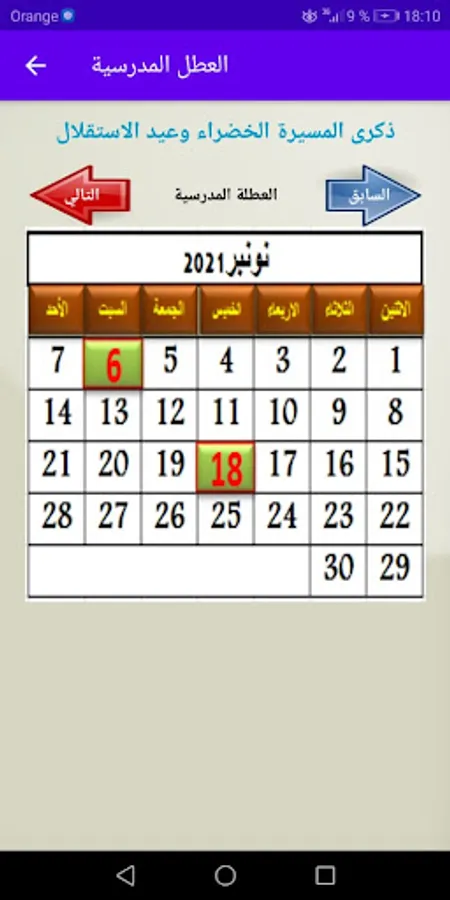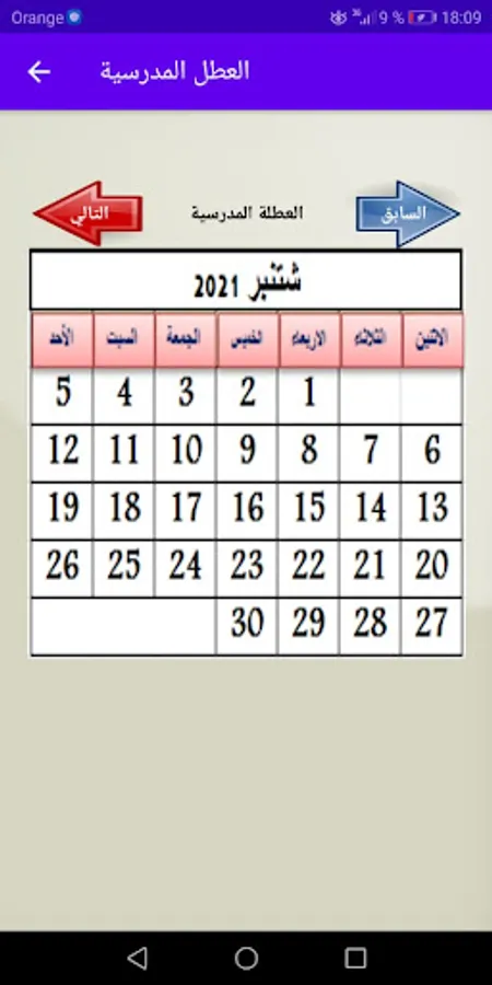 The application presents the school holidays in the form of a daily phone and opens directly to the current month