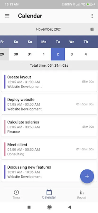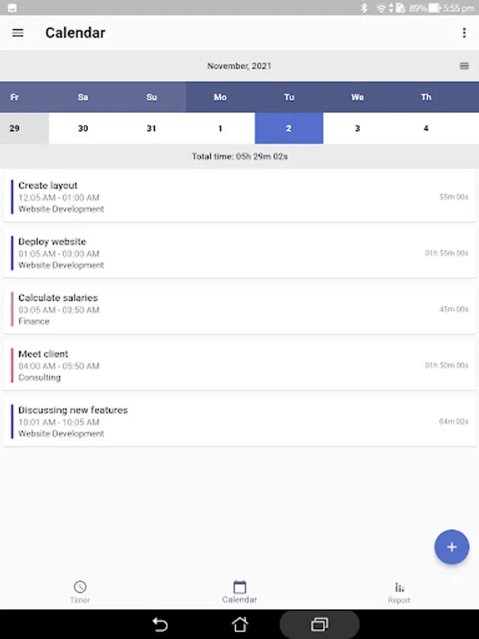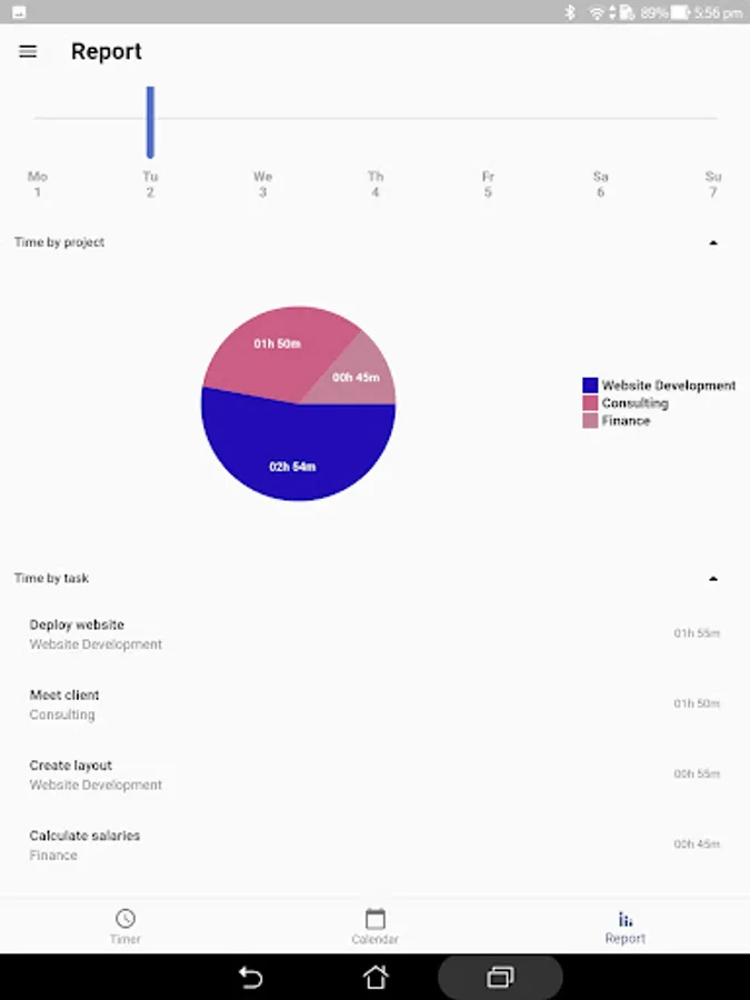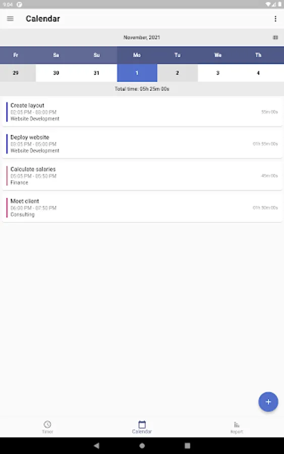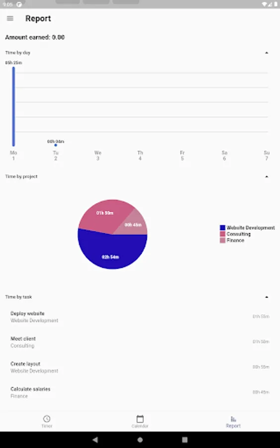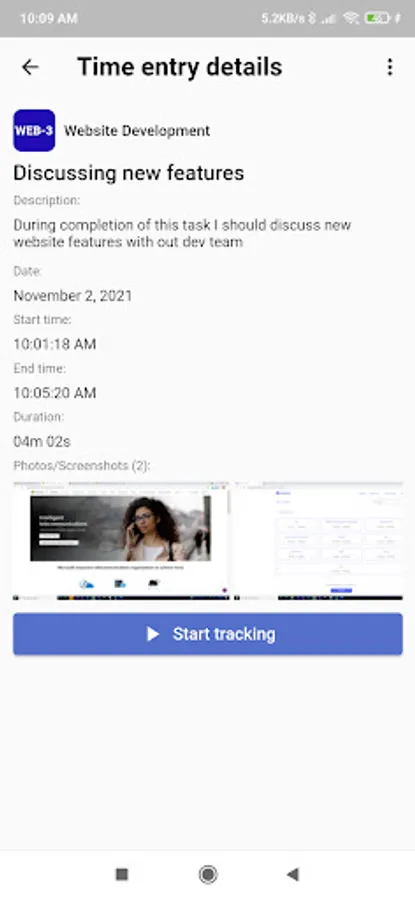 On Calendar screen you can browse all your time entries, filter them by project/task and sort. Tap on any time entry and you will see it’s details: