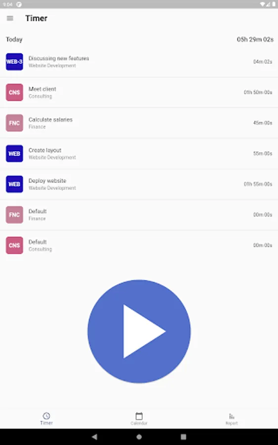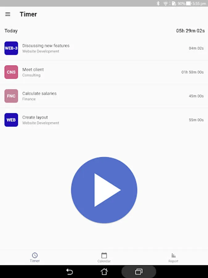 On the Timer screen tap Play button and select project with task on which you are working on, optionally add photos and tap the Clock In button. Track some time and tap on the Pause button. Your time will be synchronized with your account and will be visible in Calendar and Report screens