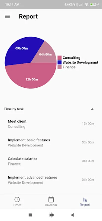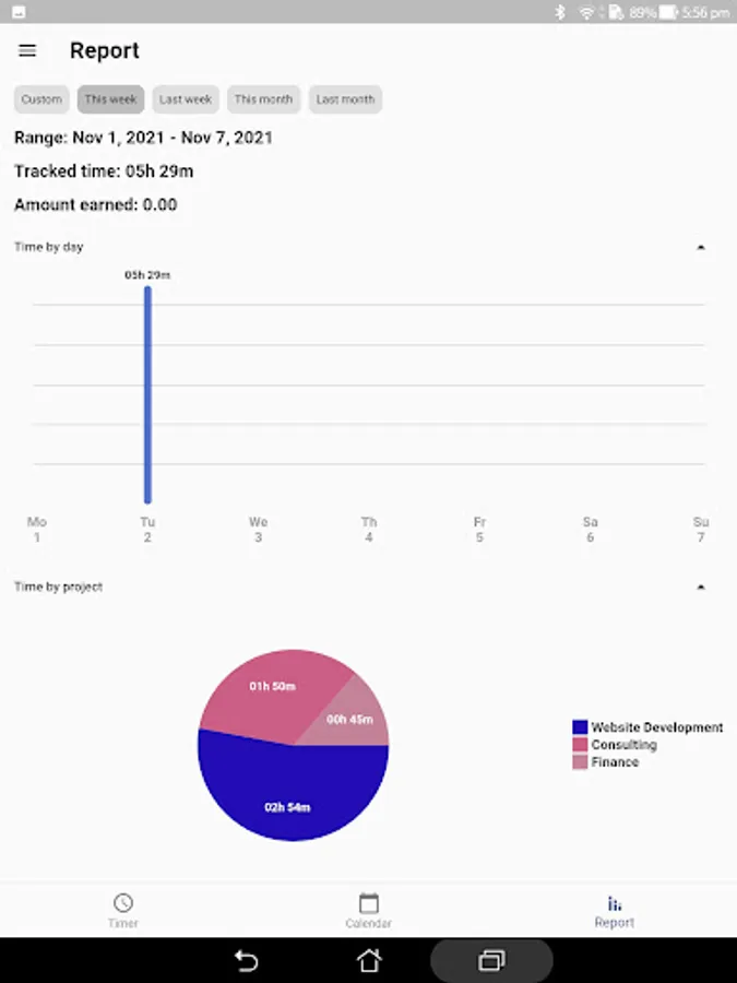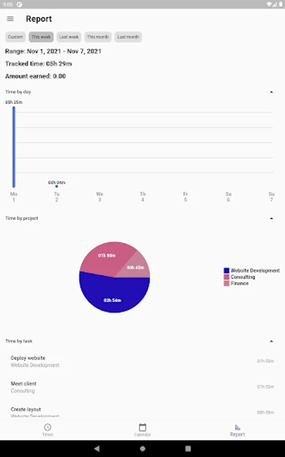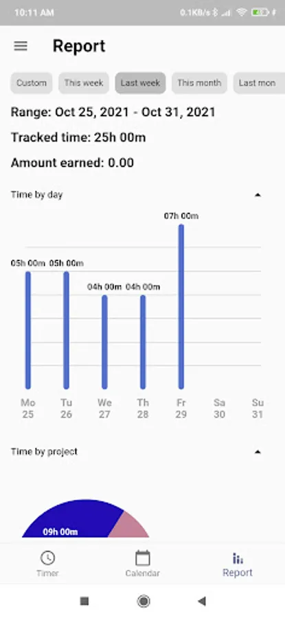 Report screen allows you to see full picture of how much time you spend on your projects/tasks. You can select any predefined or custom range for which the report is rendered and see a breakdown of tracked time by day, project and task. You can also export the report and share it with your employer.