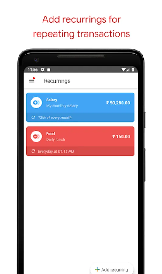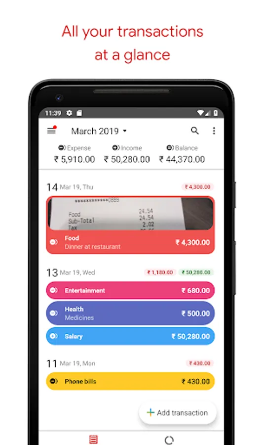 • Track transactions: Monito takes care of your transactions by providing a separate view. They are shown with different colours. You can even add a photo of your receipts with the transaction.