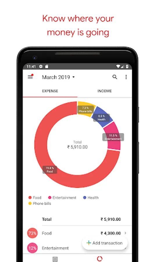 • Analyse using graphs: Monito shows powerful graphs to analyse your incomes and expenses.