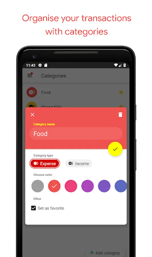 • Manage using categories: Monito allows you to add categories to group together your incomes or expenses. You can set colours to categories to easily distinguish your transactions.