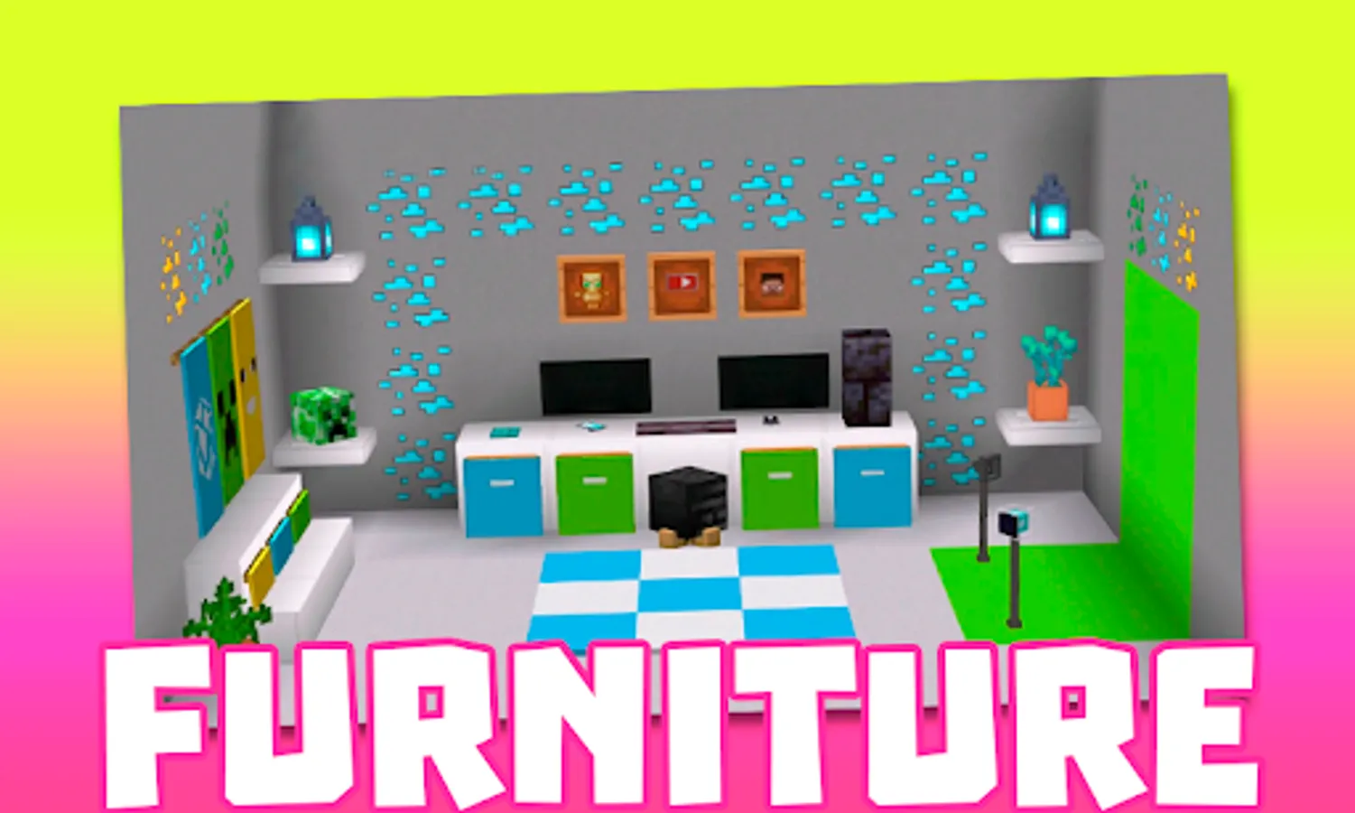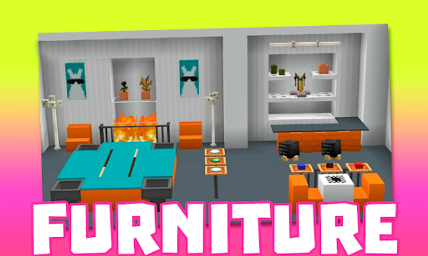 Furniture MOD for Minecraft PE is a set of mods for Minecraft PE that adds a range of furniture and decoration to the Creative Mode. Indoor rooms will have a perfect modern appearance. Simply add a computer, television, bookshelves, a bath, toilet bowls, and more! Easily!