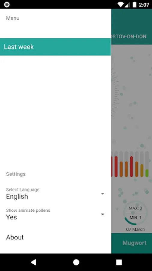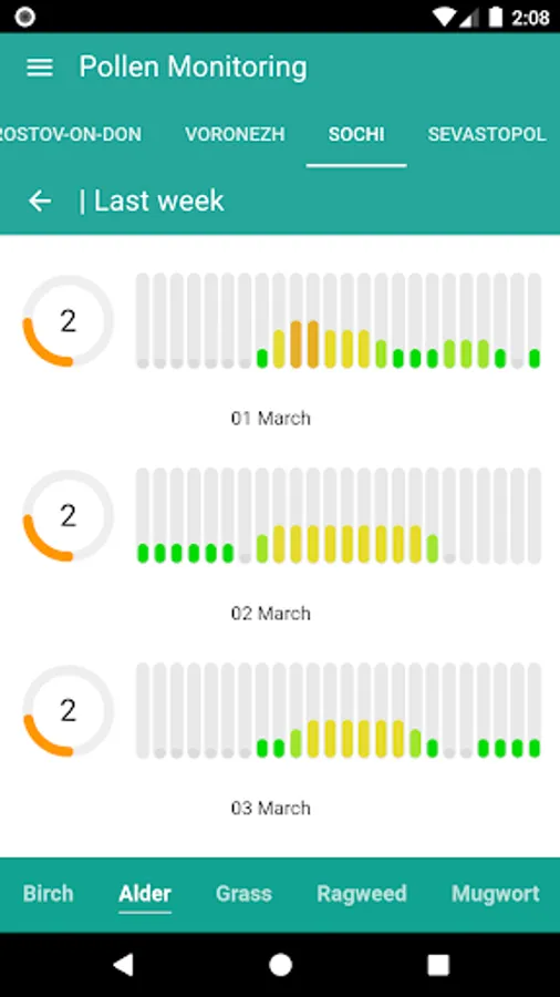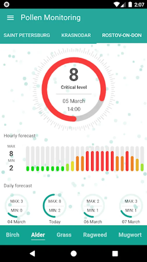 The app provides users with detailed information on the current level of air pollution with pollen of allergenic plants. It provides detailed graphs showing the level of pollen over the current day and builds a forecast for the following two.
