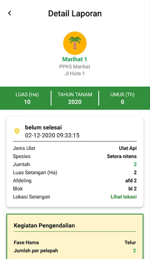 Oil palm plantations really need an early warning system against pests and diseases. With this system pests and diseases can be controlled below the economic threshold. This system also displays a suggestion feature for control time based on pest and disease biology. The features of this system are very complete, covering all pests and diseases of oil palm. This system is also able to accommodate if there is an overlapping stage.