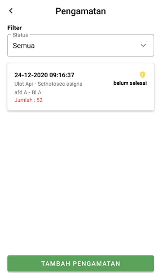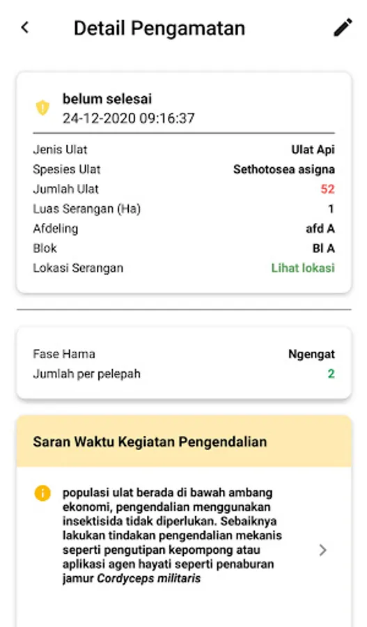 Monitoring oil palm pests and diseases is the lifeblood of successful control of oil palm pests and diseases. With the results of this monitoring, the population of pests and diseases can be monitored accurately. The results of this monitoring are also very effective and efficient because they are also monitored by superiors. This application includes a monitoring system for all oil palm pests and diseases