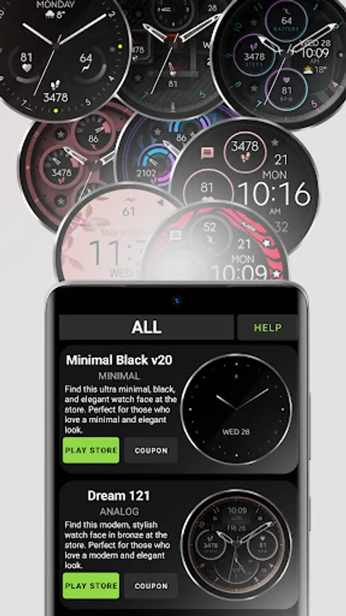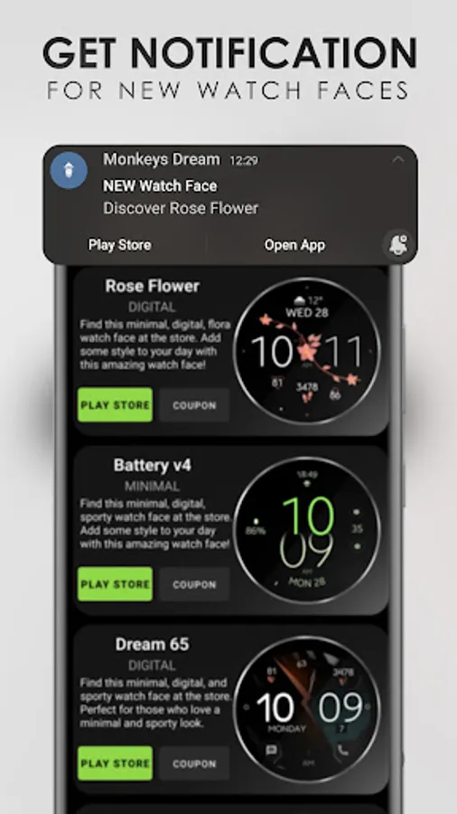 Our unique watch faces catalog allows you to customize your Wear OS smartwatch with exclusive and fashionable designs. Our watch faces are modern, minimal, colorful, analog, digital, floral, and of all types. Get notified every time we publish new designs, so you never miss an update.