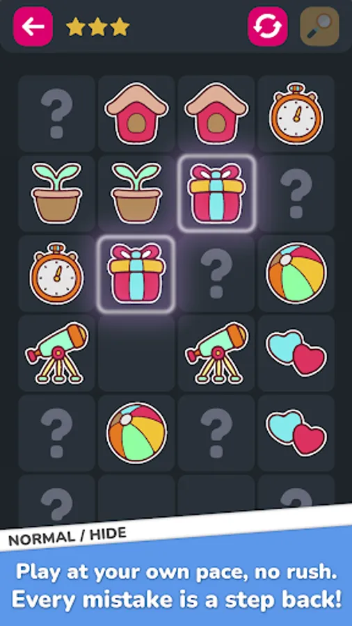 1️⃣ Normal: Play this memory card game at your own pace, with no time or attempt limits.
