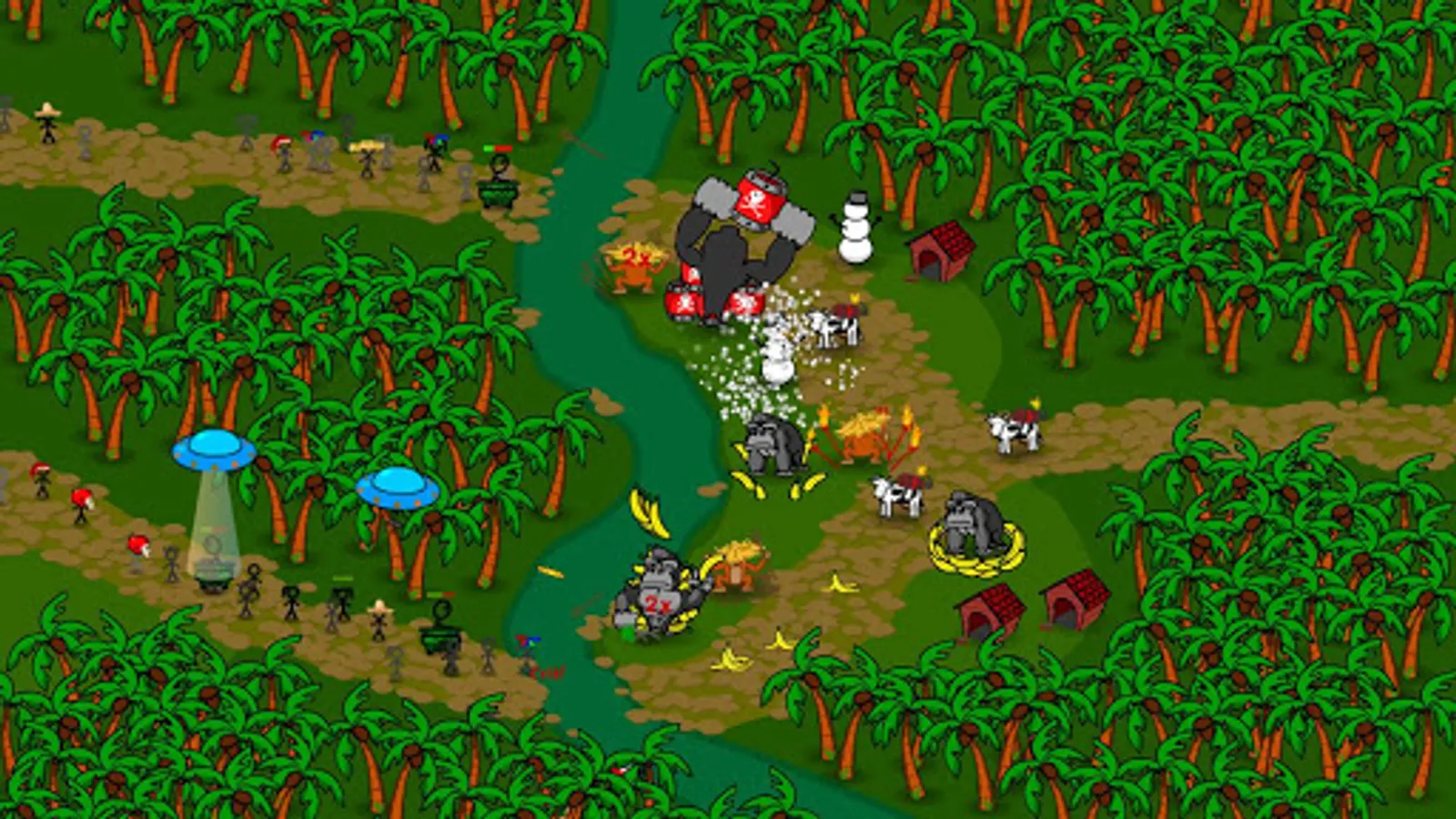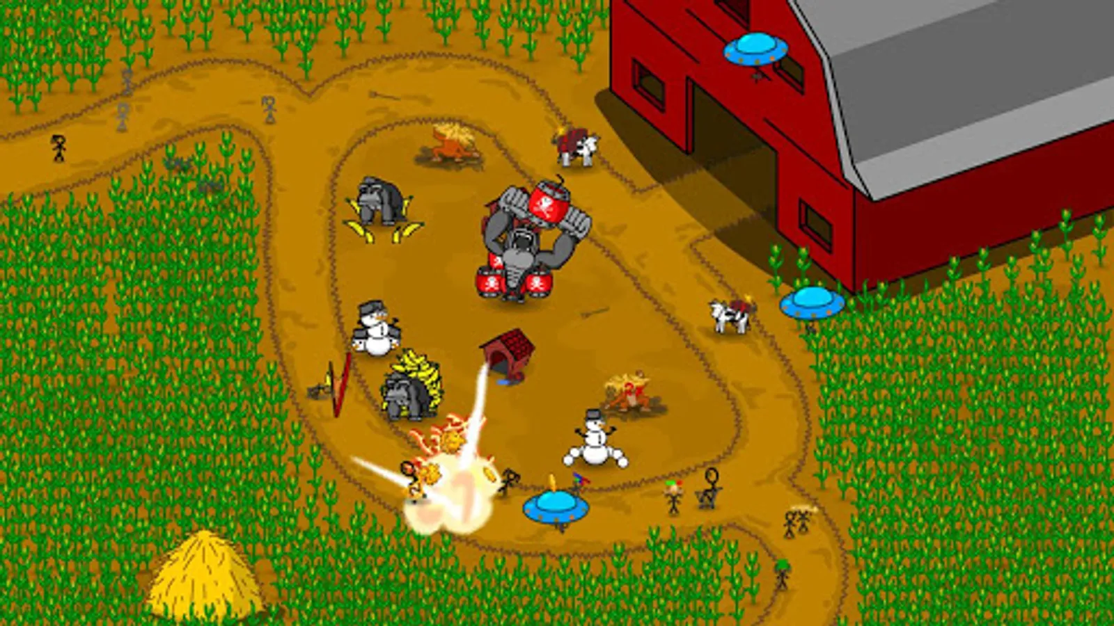 Fight off waves of groupies through epic battles of bananas, pitchforks, and the occasional UFO.
