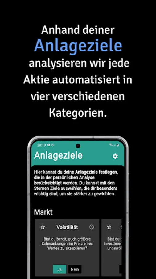 Your personal investment criteria, such as your investment horizon, your interest in dividends or industries you do not want to invest in, are automatically evaluated for each stock. You can then see in our personal analysis in which criteria a stock fits your attitude or if there are more suitable stocks for you.