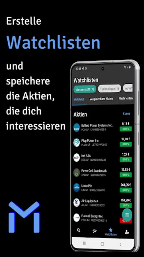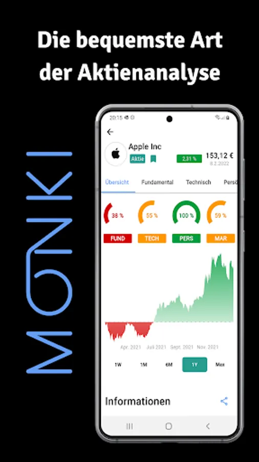 MonKI Finance analyzes stocks for you in a fully automated and personalized way. Four categories are analyzed for each stock: Fundamental Analysis, Technical Analysis, Market Analysis and Personal Analysis. You can also get information about today's market events at a glance. You can find stocks, ETF, indices, industries and crypto with current price data.