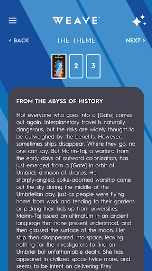 Weave is a 21st century storytelling game for everyone. With two decks of cards and a handful of dice, you and your friends can create adventures in any genre, from sci-fi to high school comedy. You and your friends create the story, Weave provides the worlds and the platform to store you stories online.