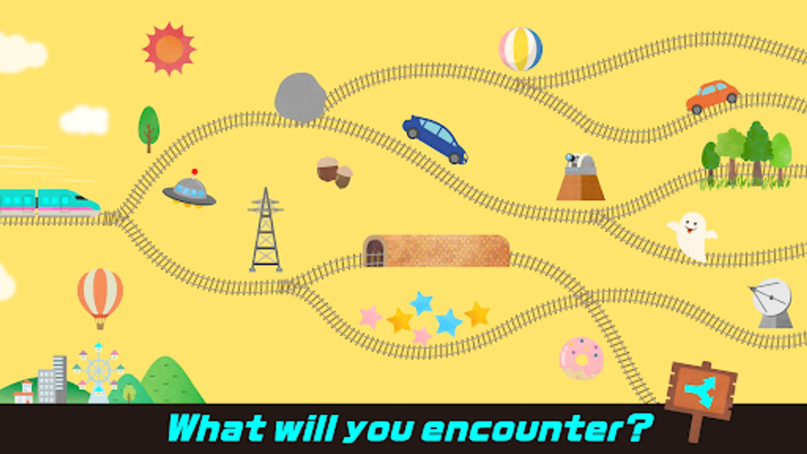 The bullet train runs through stages such as an urban city, a peaceful mountain, and an amusement park! You will find different places such as railway bridges, tunnels, and rail yards at the end of different paths!