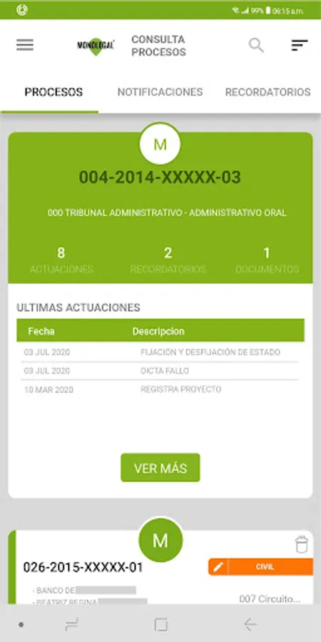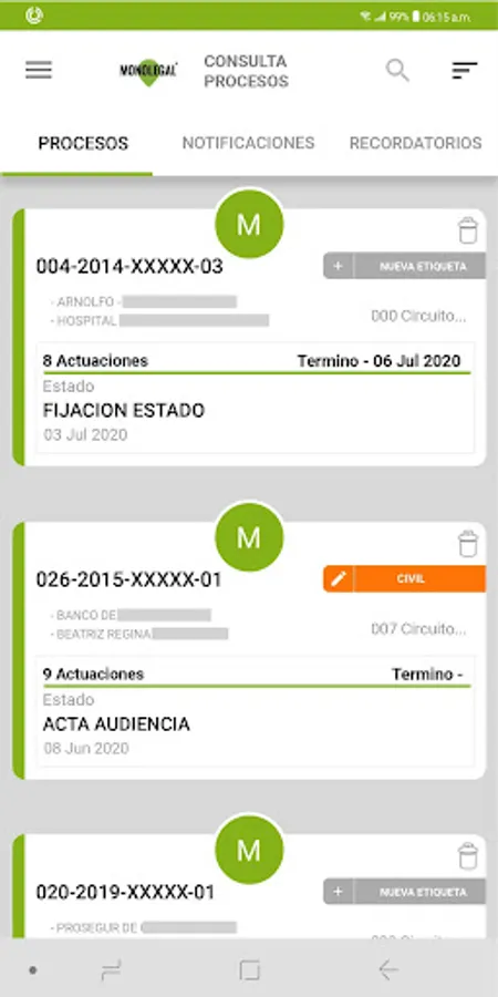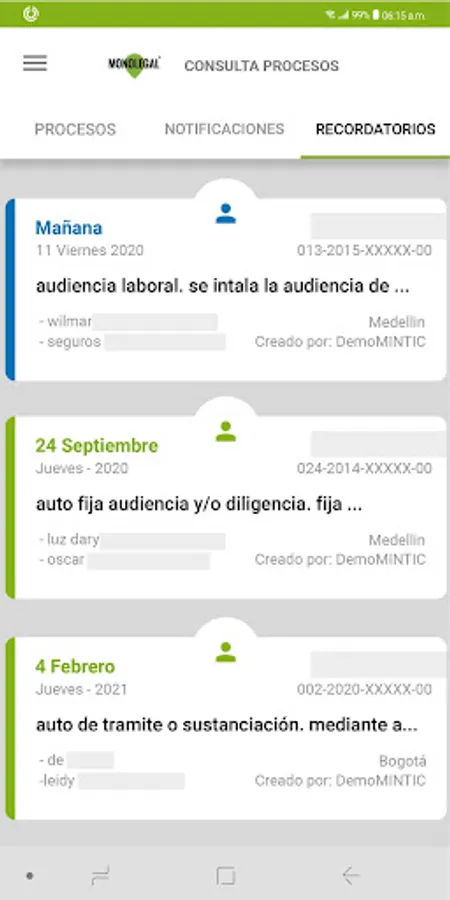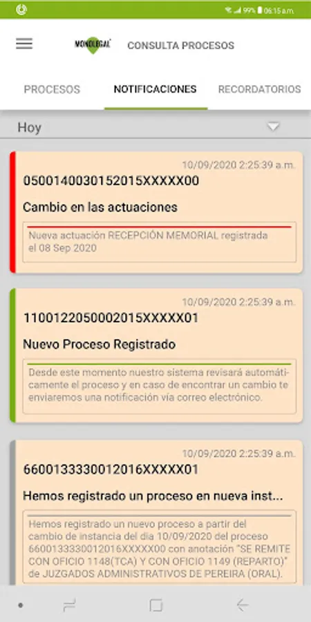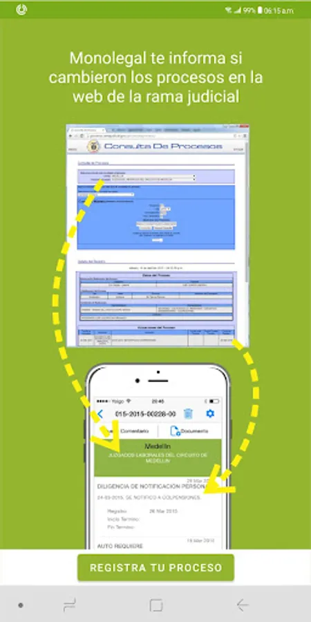 We consult daily the official data source of Consultation Processes of the Judicial Branch of Colombia and we notify you of new actions to your email, mobile application and web platform accessing from http://www.monolegal.co