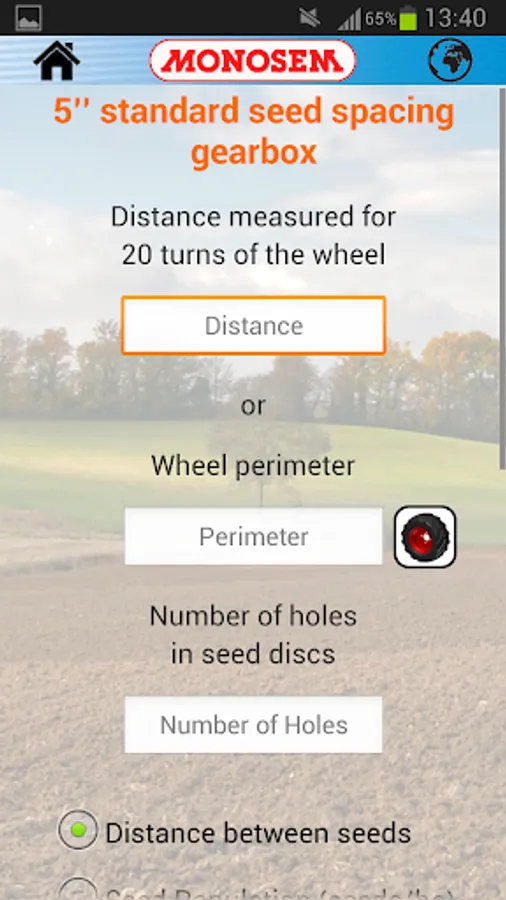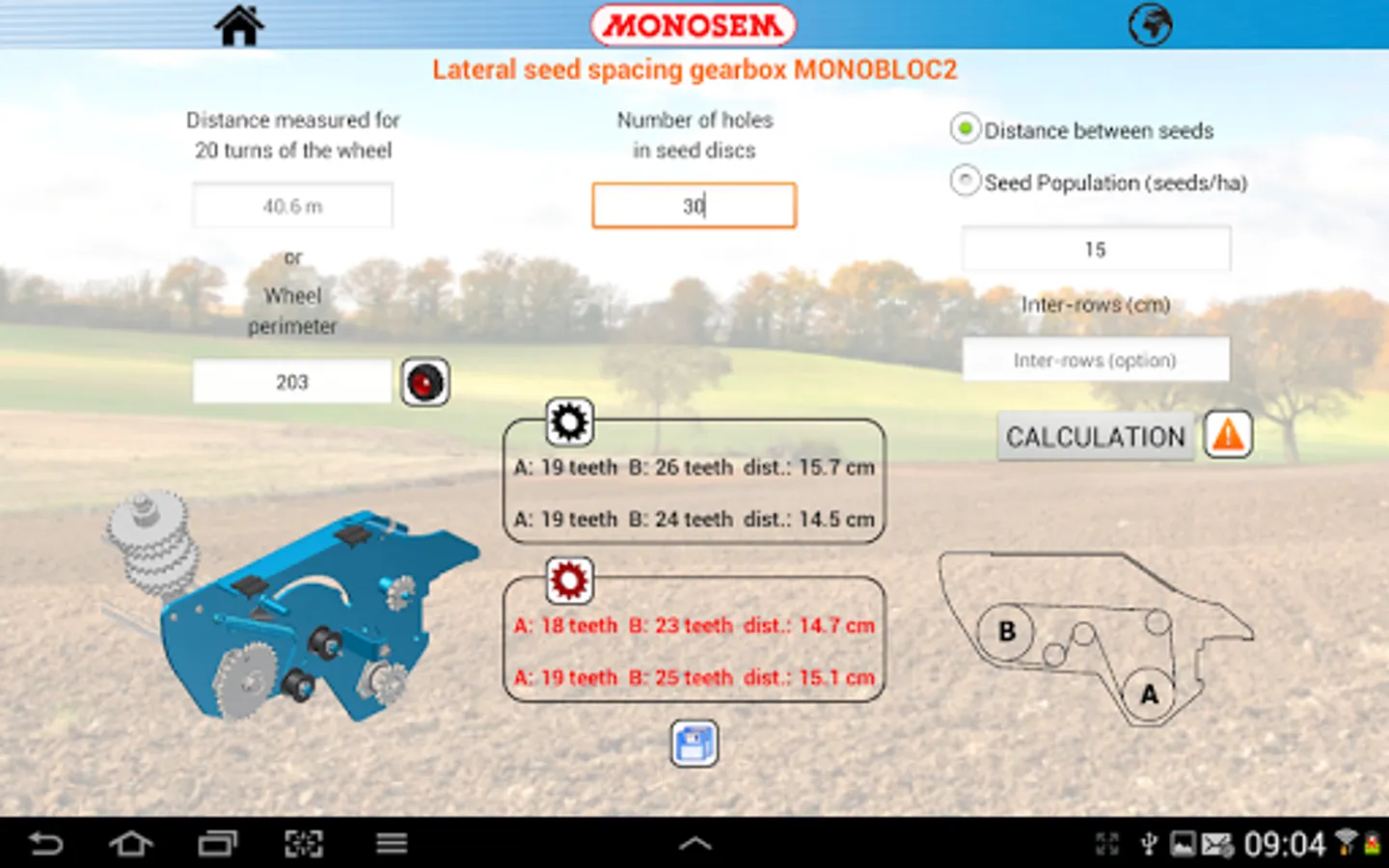 Once the adjustment made and the planter characteristics given (model of planter and gearbox, inter row spacing and number of holes on the discs), the user has just to indicate the required seed population (population/ha or distance between seeds) to know the appropriate gearbox ratio. The application proposes the ratio corresponding exactly to the required adjustment or the upper or lower ratios the nearest to the required adjustment.