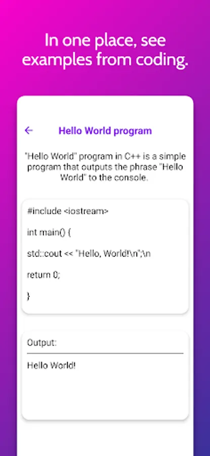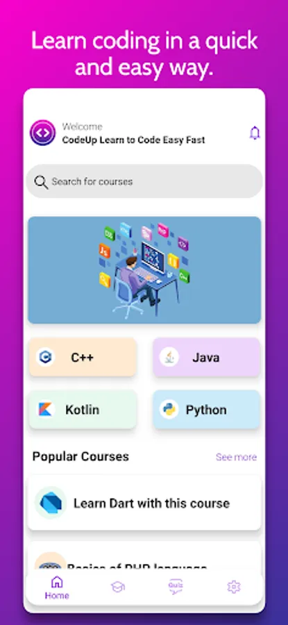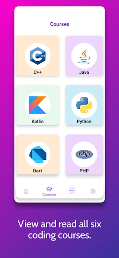 Our coding app is a user-friendly tool for learning programming languages, such as Java, Python, C++, HTML, CSS, and JavaScript. With interactive tutorials, quizzes, coding challenges, and access to a community of coders, you can develop your skills, collaborate on projects, and build a portfolio. Whether you're a beginner or an experienced coder, our flexible app can help you reach your coding goals.