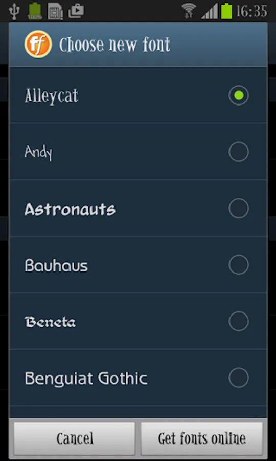 Go to Setting->Display, check if you see "Font syle" in the menu (FF icon in the font list).