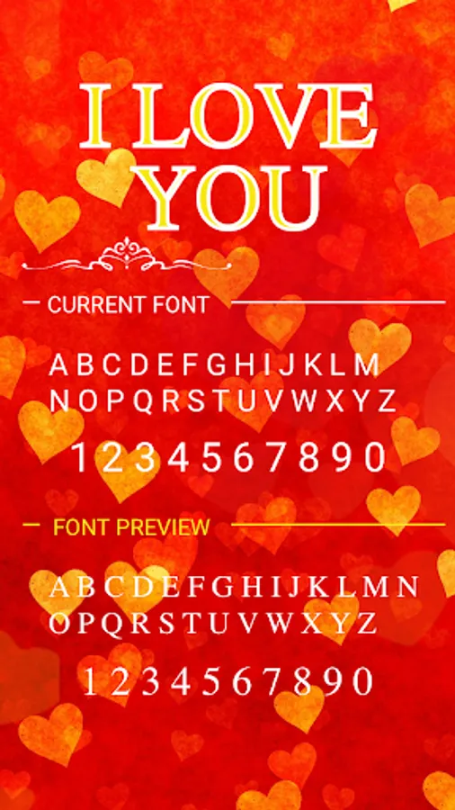 Please enjoy the pack of Fonts for Android FlipFonts to provide you the ability to change your deviceβs typeface for free. Using the FlipFont font changer program installed on your Samsung Galaxy. Please browse through our FlipFont packs and our bundle font explorer is prompted. You can find the amazing and perfect font style which fits your taste well. Change your entire phone font into Iloveyou. Come and experience the customized font for you. The feature of Iloveyou is compatible ability. Itβs time to be the decider of your own phone ππ. And you can search other fonts like Iloveyou through Hifont app.