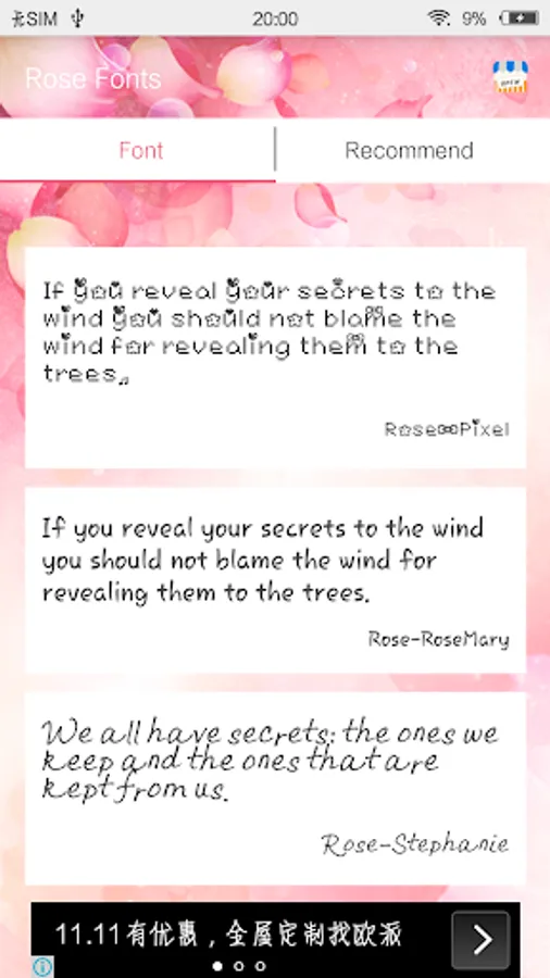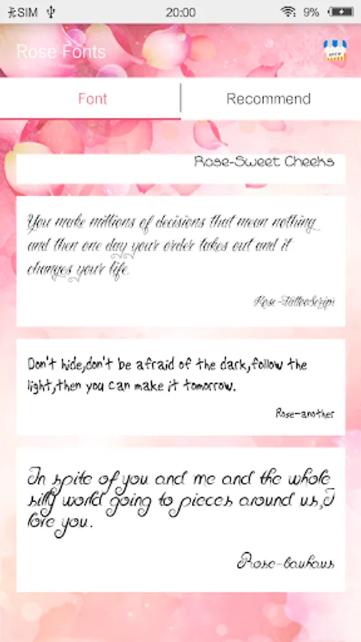 Rose Fonts pack is much easier for you to customize your phone fonts for free. It will make your phone amazing and unique among your friends.Please enjoy it and it will provide you a wonderful experience!