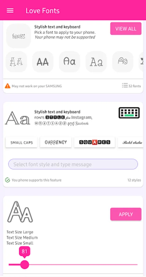 This fonts package comes with a font scaling tool and now a stylish fonts keyboard that works on any phone.