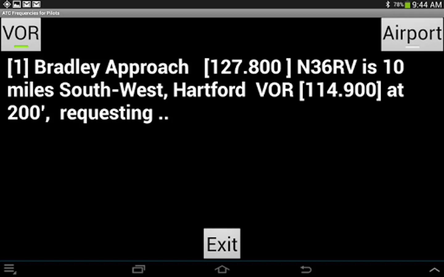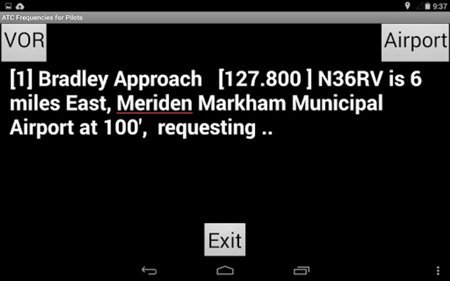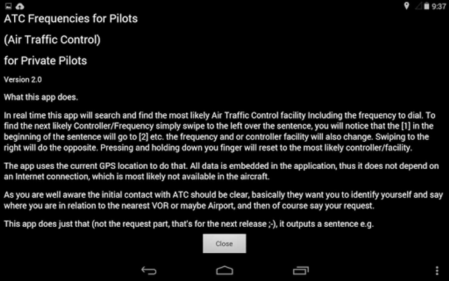 This app is for VFR Private Pilots, it helps you locate an appropriate Air Traffic Control Facility and Frequency. It will also display the information you need to provide to ATC for the initial contact. It uses your phone's GPS to provide proper location information for Air Traffic Controllers to pin point you on their Radar. You can now toggle between the most 10 probable ATC facilities and frequencies that can offer you flight following. You do this by Swiping to the Left/Right on the display. BTW, The application and Data is for the US Only. Also note on some phones e.g. Samsung S6 Edge, the menu icon does not appear (three dots), if you encounter that, press and hold your finger on the back button for about a second, the menu will appear. Also make sure that you give this application "Location" permission otherwise nothing will work, as it uses your location to work properly.