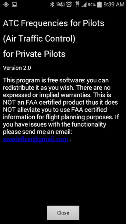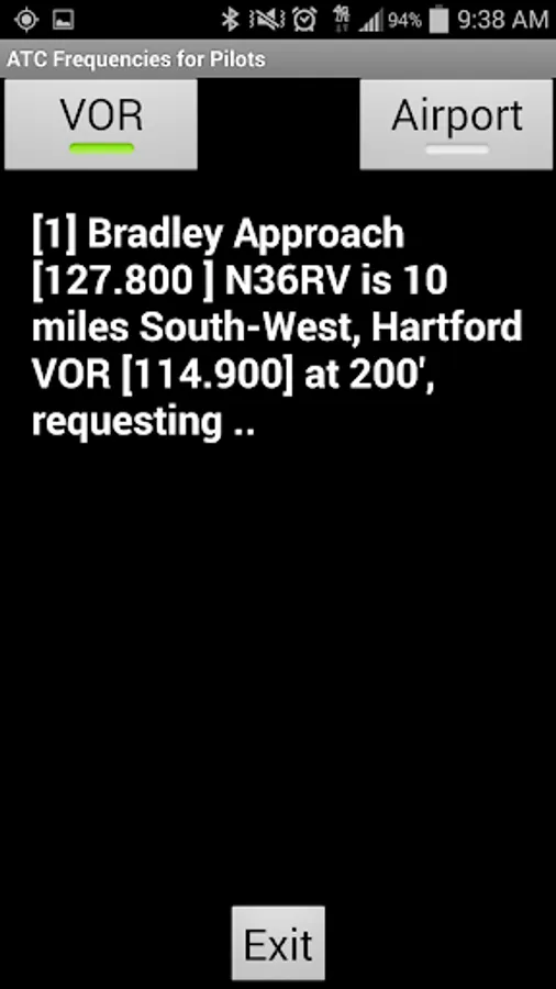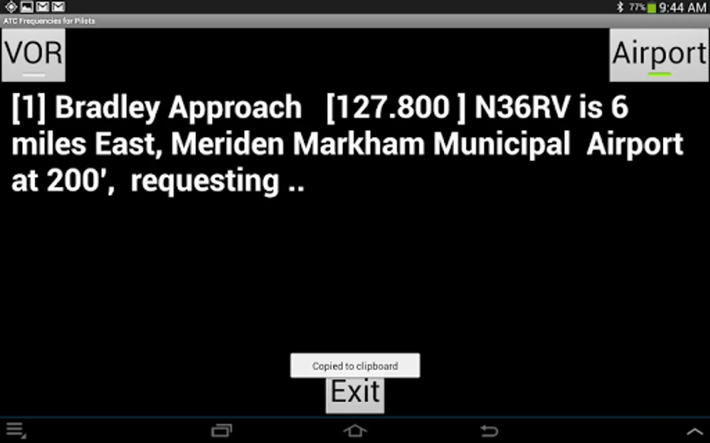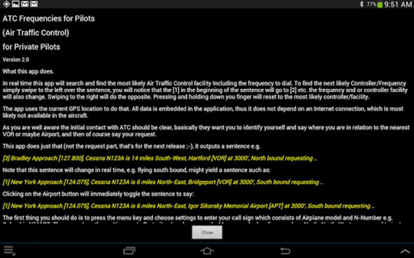 This app is for VFR Private Pilots, it helps you locate an appropriate Air Traffic Control Facility and Frequency. It will also display the information you need to provide to ATC for the initial contact. It uses your phone's GPS to provide proper location information for Air Traffic Controllers to pin point you on their Radar. You can now toggle between the most 10 probable ATC facilities and frequencies that can offer you flight following. You do this by Swiping to the Left/Right on the display. BTW, The application and Data is for the US Only. Also note on some phones e.g. Samsung S6 Edge, the menu icon does not appear (three dots), if you encounter that, press and hold your finger on the back button for about a second, the menu will appear. Also make sure that you give this application "Location" permission otherwise nothing will work, as it uses your location to work properly.