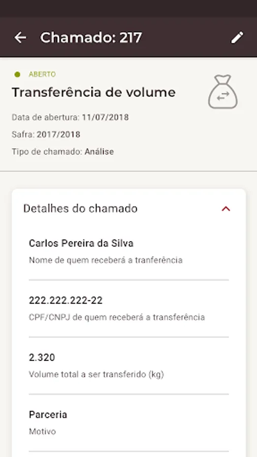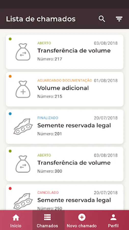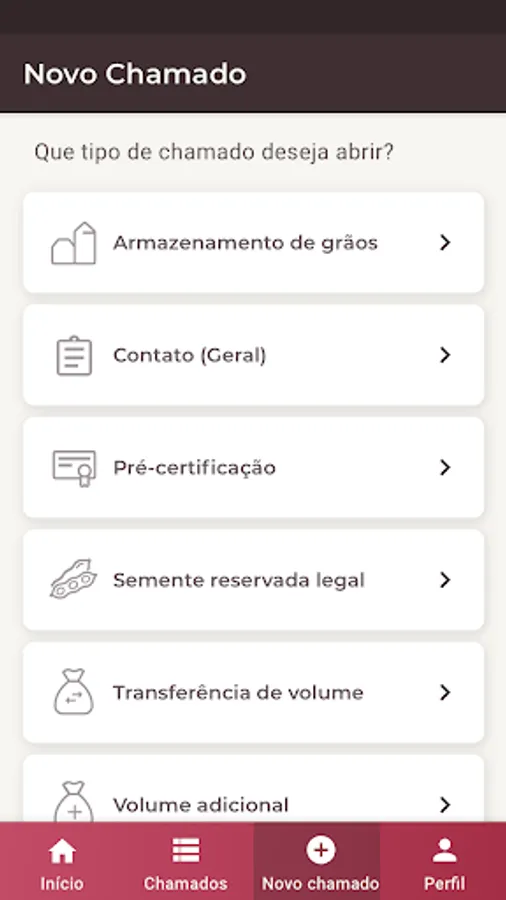 Os tipos de chamados disponíveis são: Geral, Armazenamento de Grãos na Propriedade, Semente Reservada Legal, Transferência de Volume, Volume Adicional, Segregação de Carga e Pré-Certificação, sendo este último restrito aos perfis de usuário RCI e Pré-Certificador.