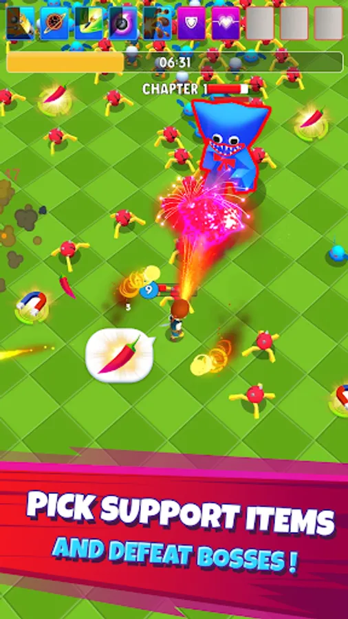 Be careful you will face with monster boss it’s time to use all the skills that you have upgraded before. When you defeat the boss monster, you will be given gift boxes it has amazing things you will need to continue to survive amid the crowd of monsters.