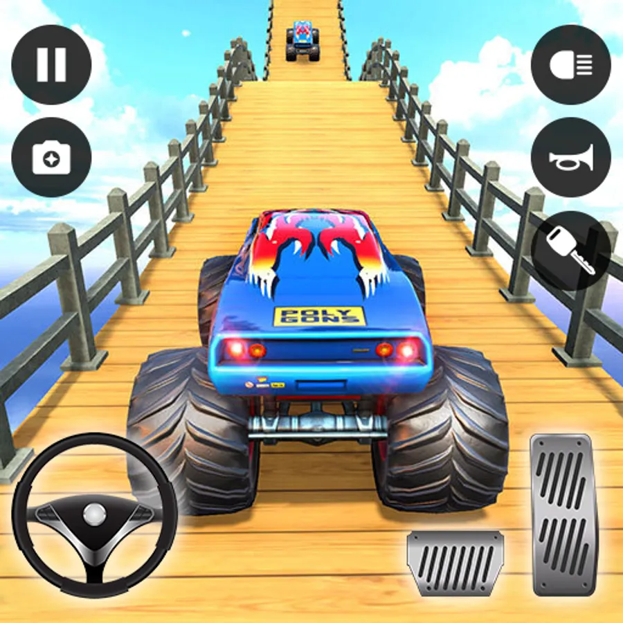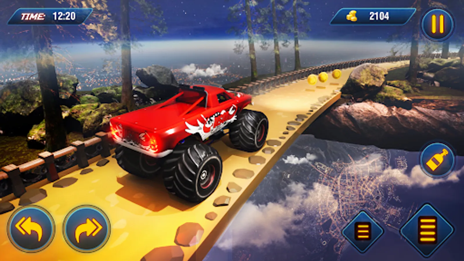 Welcome to the mountain stunts racing car game with a ramp for impossible monster truck stunts.