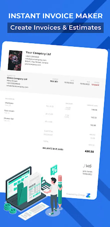 Zintego is an easy to use invoice maker that is designed for small business owners, freelancers, and contractors. Download this online invoice generator on your mobile device to create, send and track invoices. This software for billing helps you get paid faster as it allows you to manage your payments on the go. Use it today to check receipt templates and invoice examples. Create and submit a quote or a free invoice before you leave your client.