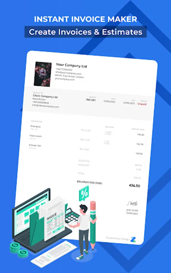 Zintego is the most modern, safest and easy-to-use app designed to create professional invoices, estimates, and quotes. Combining invoice generator, templates, PDF invoices, online payment business reporting in one software, it’s the best choice for developing your small business.
