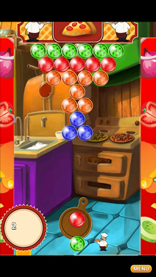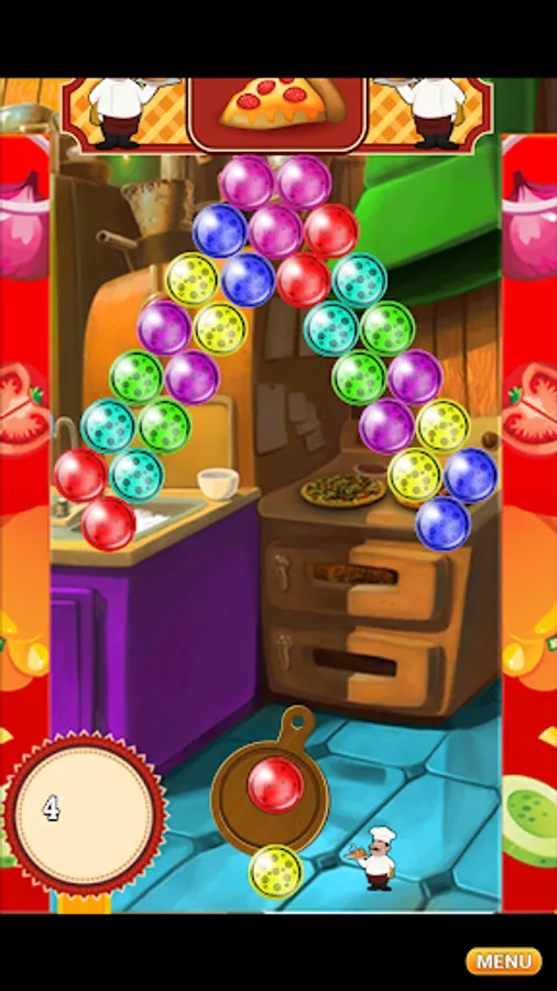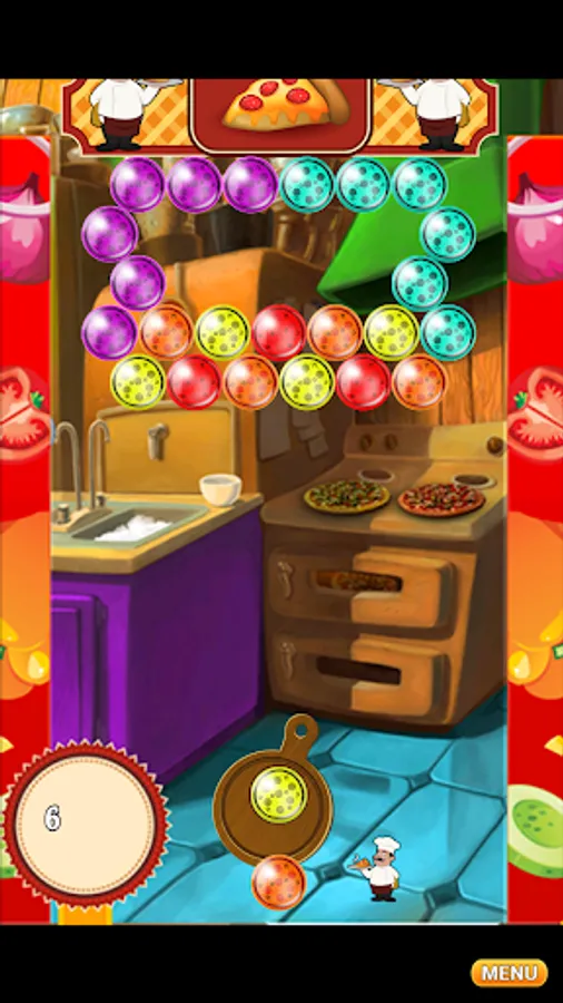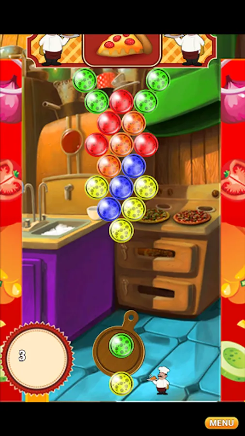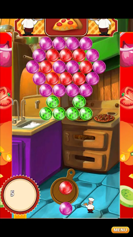 Use the special pizza pan cannon to aim and correctly find an accurate angle to shoot a specific bubble creating groups of 3 or more same color pizza bubbles.