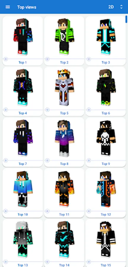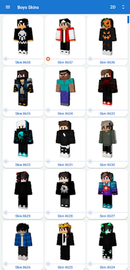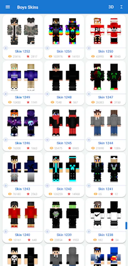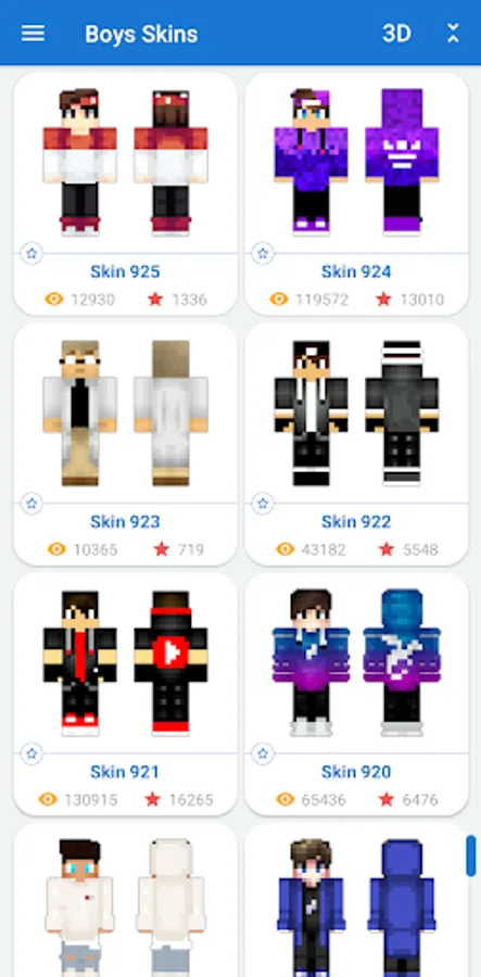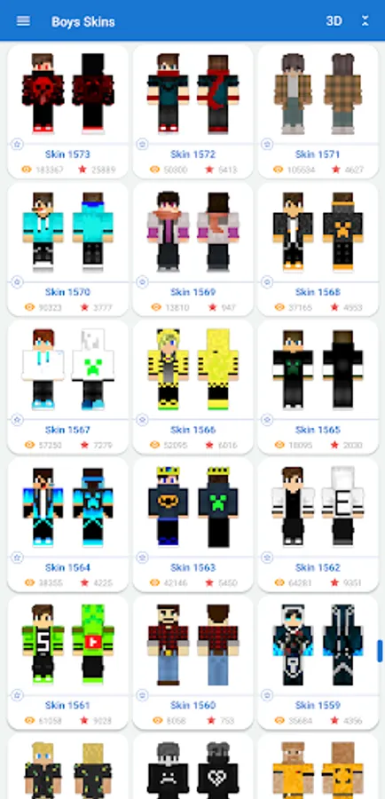 You can add skin to favorites or make your own skinpack to install in the game. To do this, just simply click on the star icon on the skincard you like. Also, our skin app users can sort mc skins by views or favorites to find the most viewed and popular and start to be the pro Minecraft player.