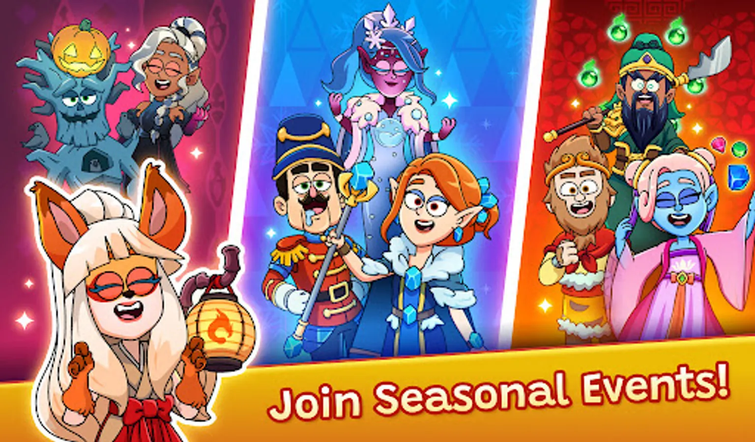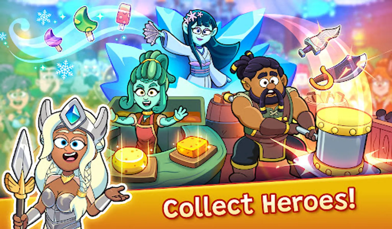 🆙Level up your heroes and magical creatures like cooking dragons, magical wisps, chopping gargoyles, and carving beavers to maximize their awesome abilities and powers