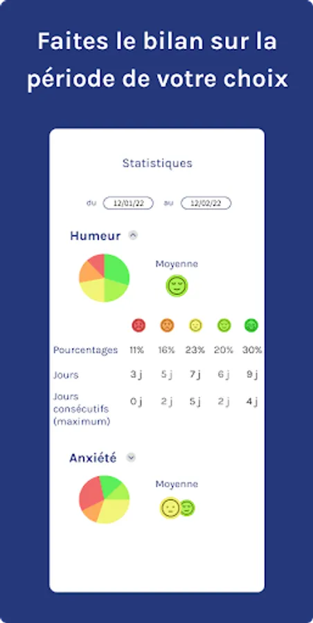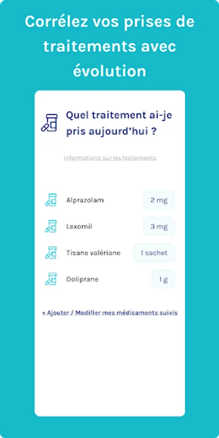 In "My entries": you will find your daily questionnaire where you can follow your indicators such as "anxiety, anguish, morale, mood, stress, melancholy, sadness, motivation, quality of sleep, libido, insomnia" or behaviors. You can also enter your treatment intake, such as antidepressants, by choosing from the pre-filled list or by customizing it if it is not a drug commonly prescribed by a doctor.
