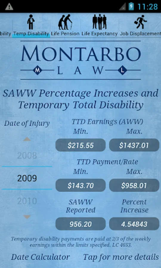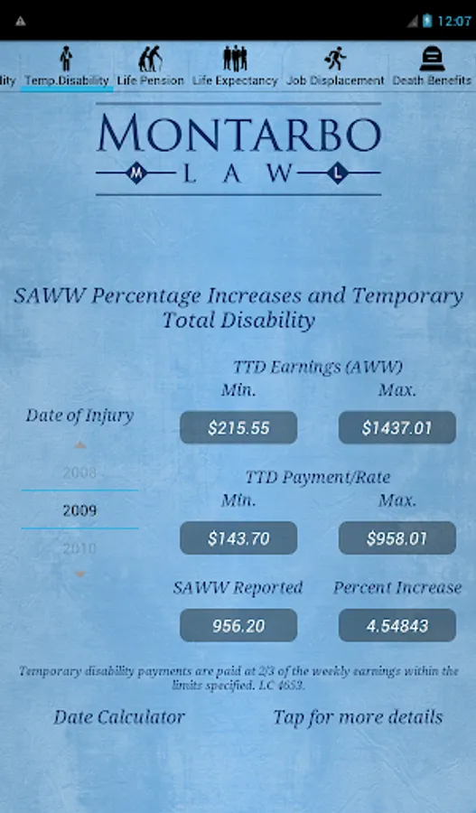 Also like the CompCalc Basic, the Plus version calculates TD liability for a given period based on the default max weekly rate for the date of industrial injury or a TD rate based on AWW manually imputed. The CompCalc Plus also provides Life Expectancy given the current age and based upon the U.S. Life Table as provided by the U.S. Census Bureau.