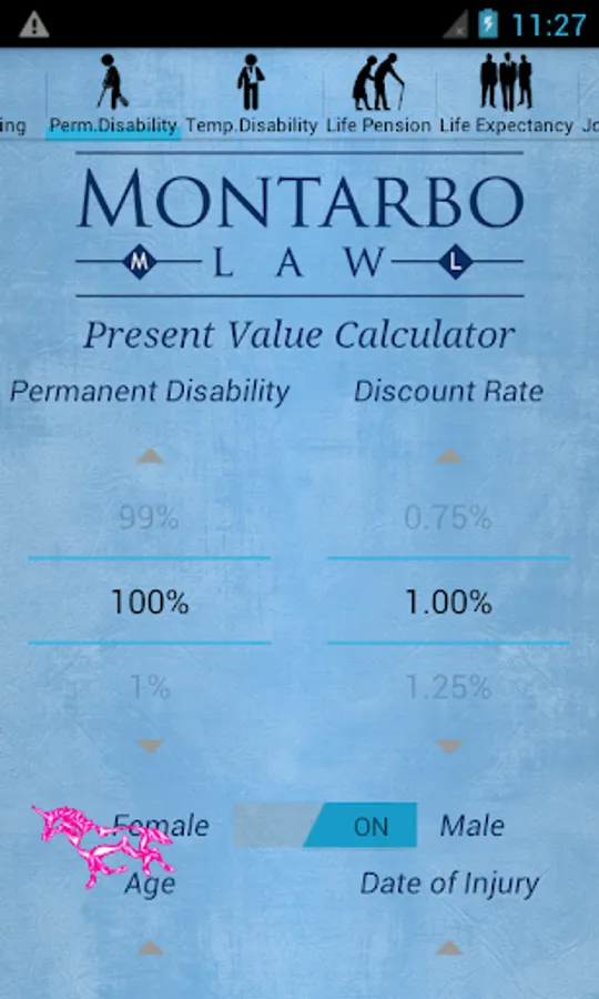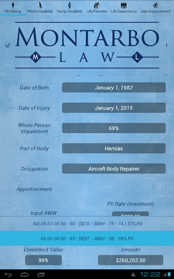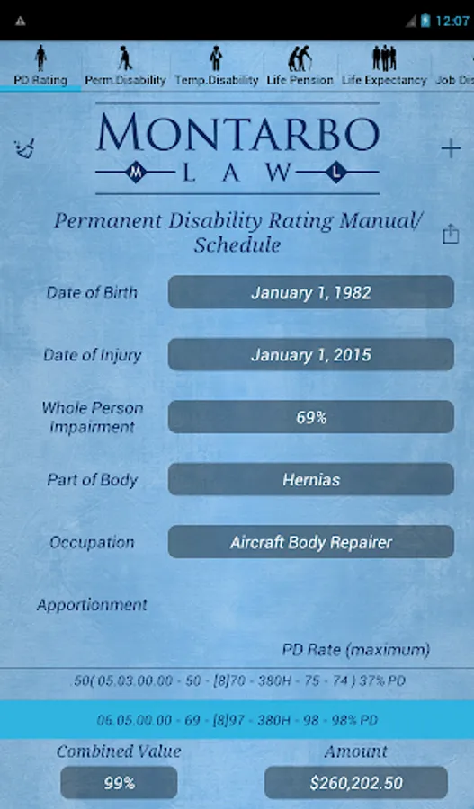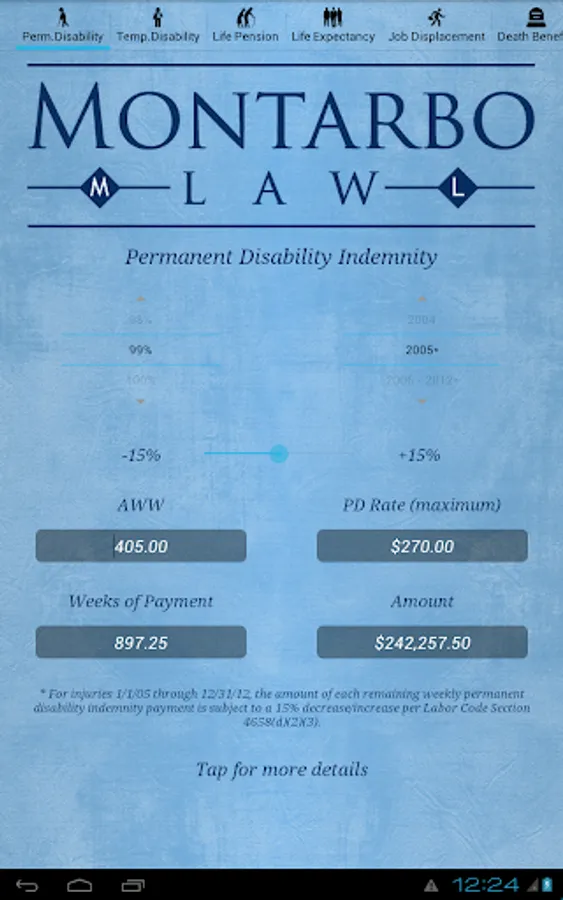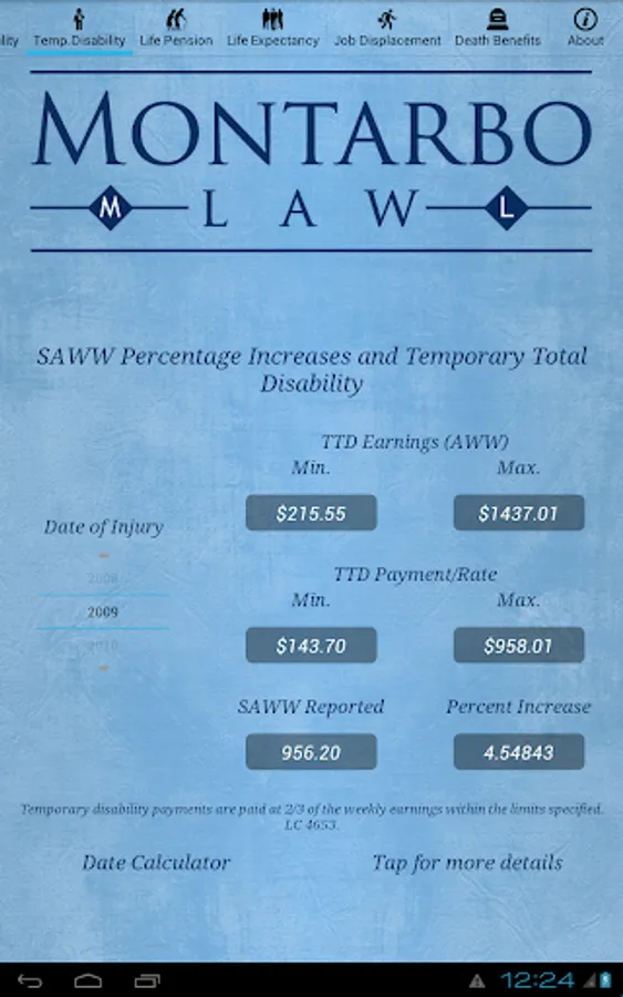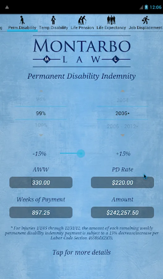The CompCalc Plus also has all the features of the CompCalc Basic including a California Workers' Compensation Indemnity Calculator that calculates Permanent Disability, Temporary Disability, Life Pension, Supplemental Job Displacement Benefits, and Death Benefits, for the given date of industrial injury.